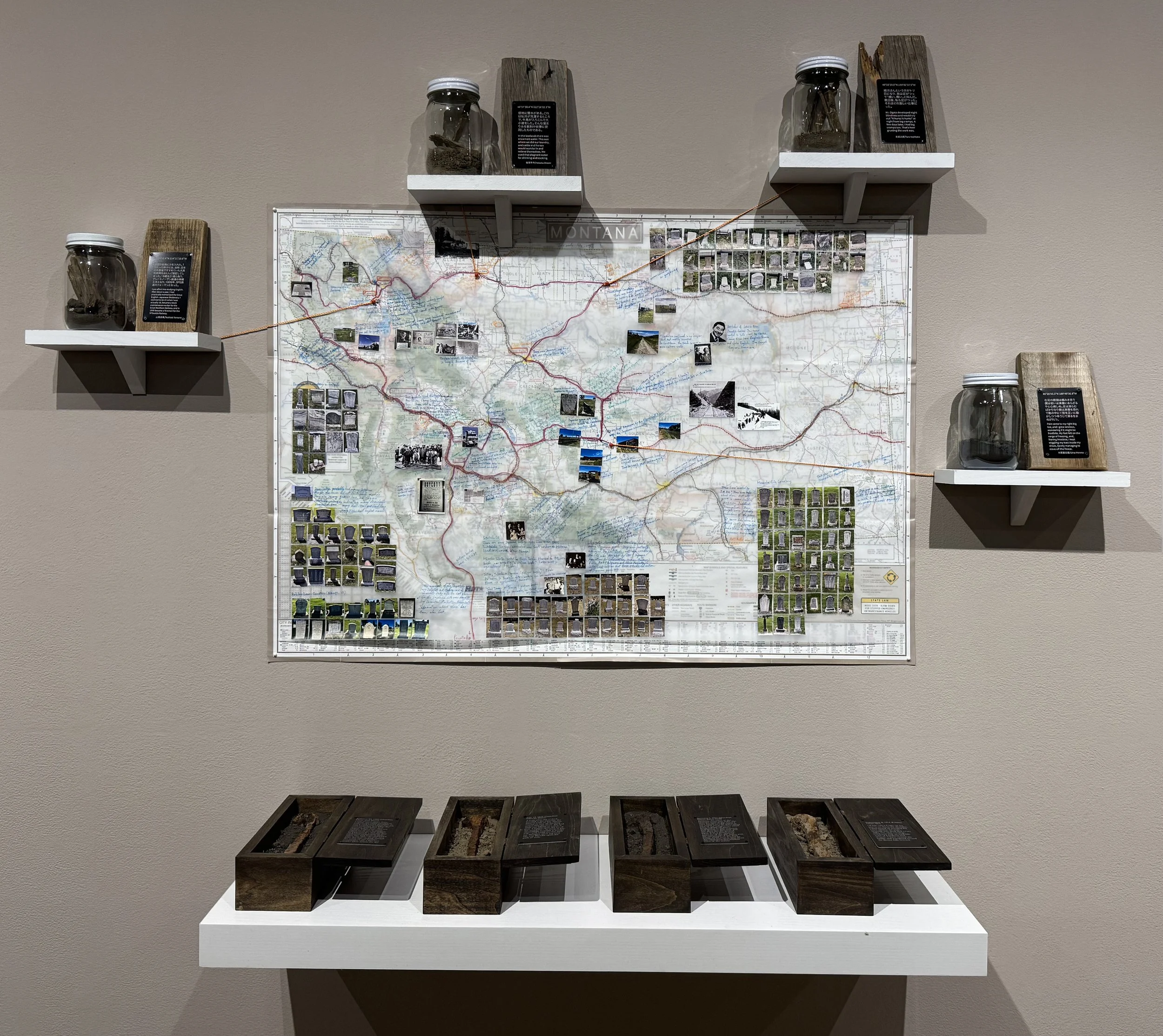 © Montana Research; Miya Hannan; Soil from historical locations in MT, found railroad spikes, wood, laser engraving (words from a diary of a worker), pens and photographs on map, 40"x48"x12", 2035