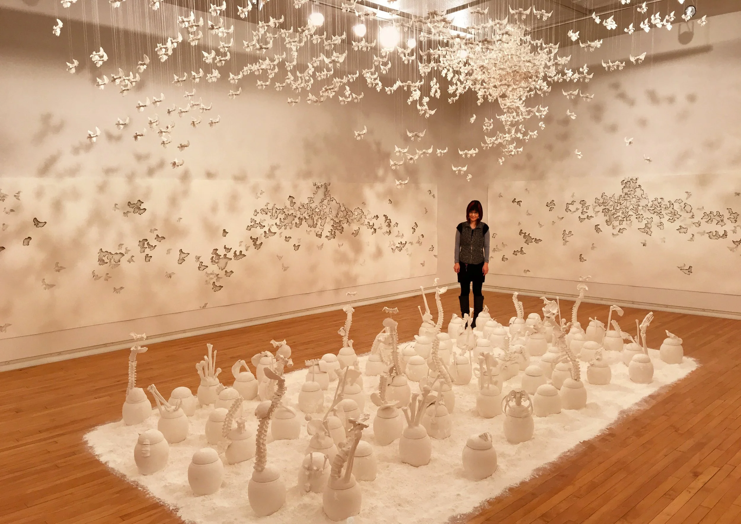 © The Story of the Sphenoid Bone; Miya Hannan; ceramics, epoxy, bone ash, ash on paper; 12' x 32' x 22' (the size varies); 2017-18