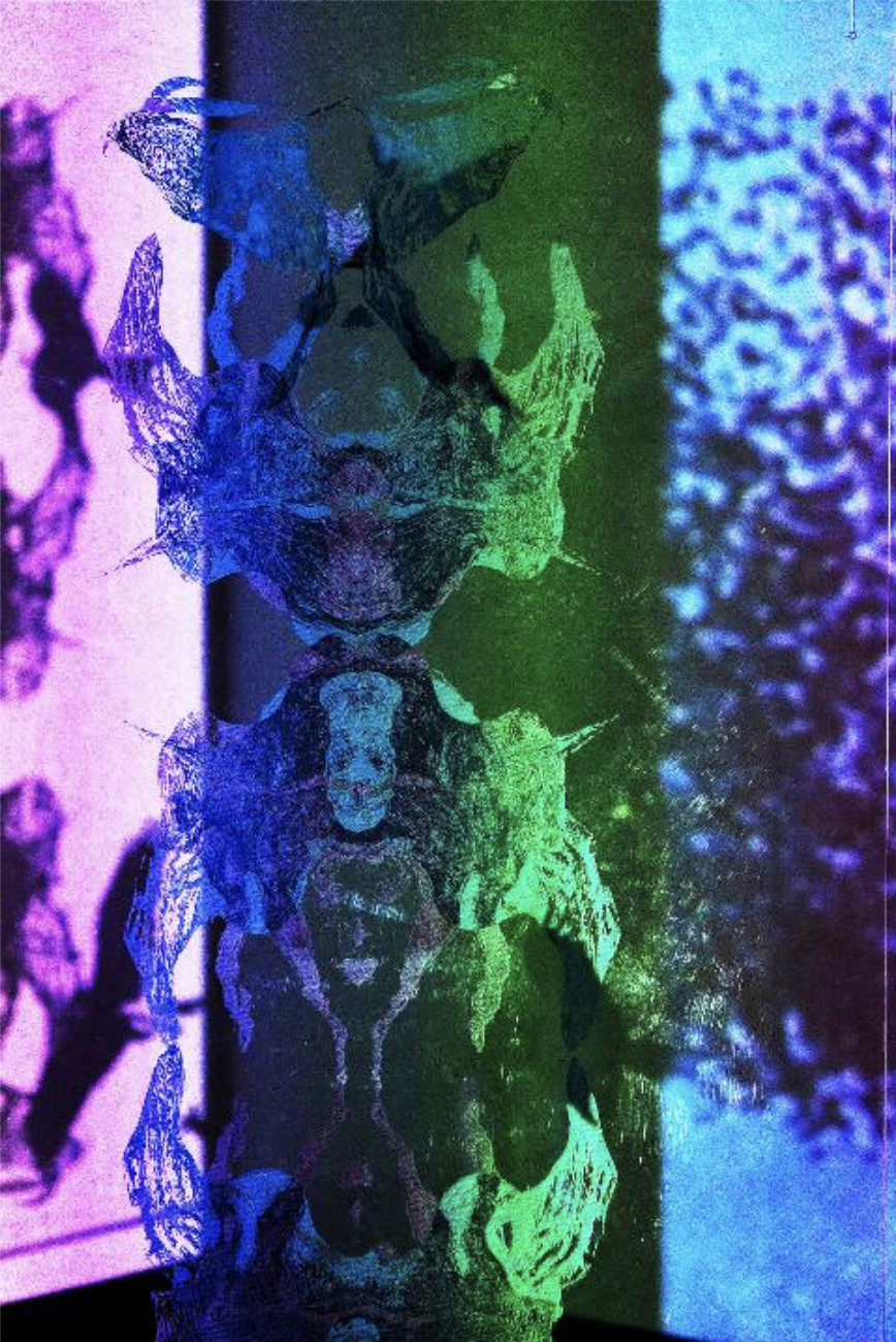 © Darya Fard, Myth Material Show Ineffable freedom Installation, Mixed Media, Performance, Projection Mapping, Video, Sound, Sculpture and Printmaking on Paper, 10' x 34’, 2024, (https://www.instagram.com/daryafardstudio/)